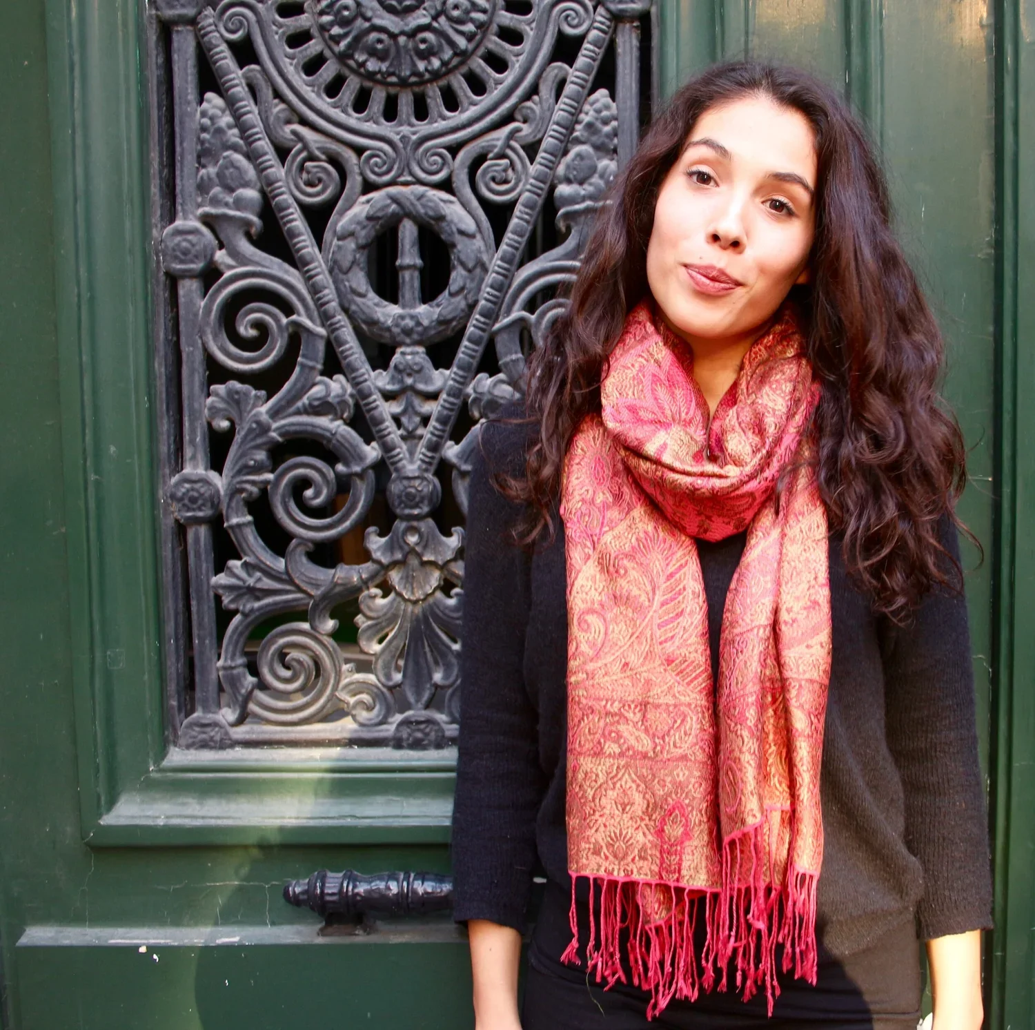 Sara in Paris wearing the Large Silk Jamavar Scarf