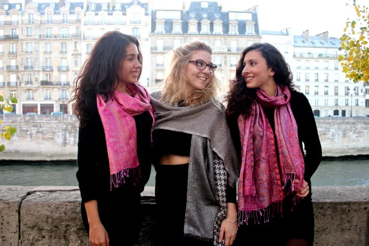 Sarah, Julie, & Salome along the Seine, Paris, France wearing Silk Jamavar Scarves