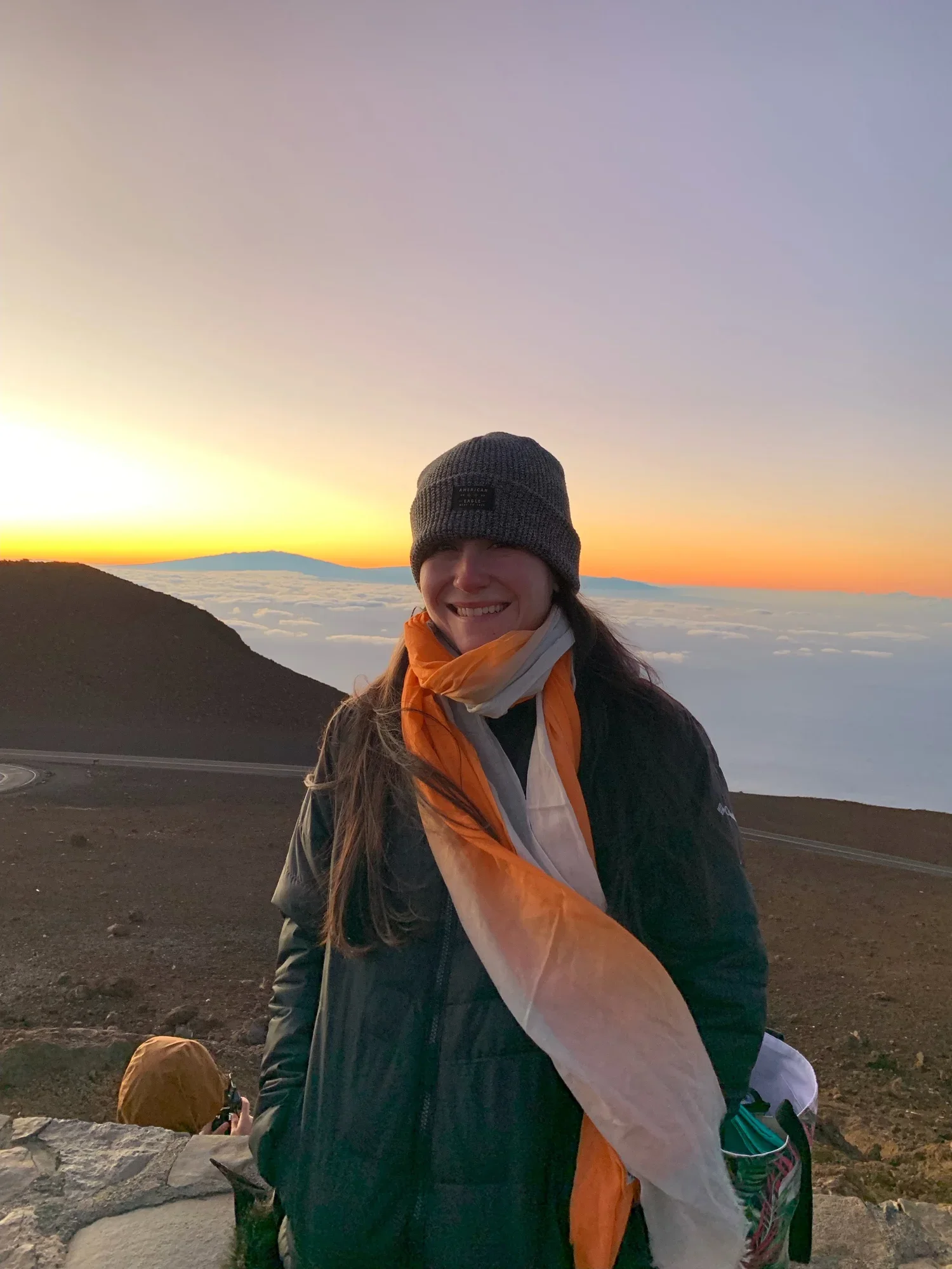 Stephanie at sunset on Maui at Haleakalā National Park wearing the Orange Cotton Ombre Scarf.