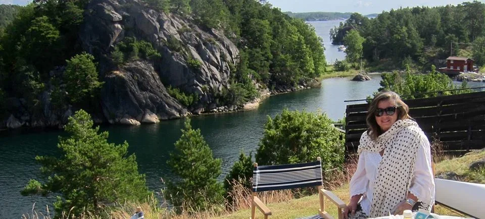 Pam dining at the Fjord of Oslo, Norway in her Organic Cotton Polka Dot Scarf